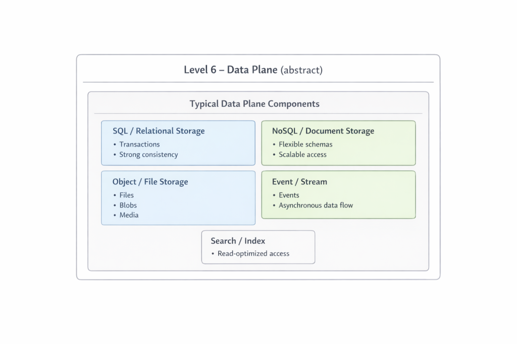 The sixth level is the domain of data. It is intentionally kept abstract here, because it deserves its own examination. Files, relations, events, and streams form the foundation upon which everything else rests. The deeper a request progresses into this level, the more expensive and slower it generally becomes. This is precisely why the ability of earlier layers to return responses sooner is such a significant advantage.