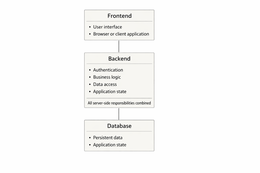 The original frontend-backend model emerged at a time when applications were often monolithic. A single server process contained authentication, business logic, state management, and database access. The user interface was a thin layer on top of this core. All server-side responsibilities were bundled into a single unit, and for a long time, this was a perfectly workable solution.